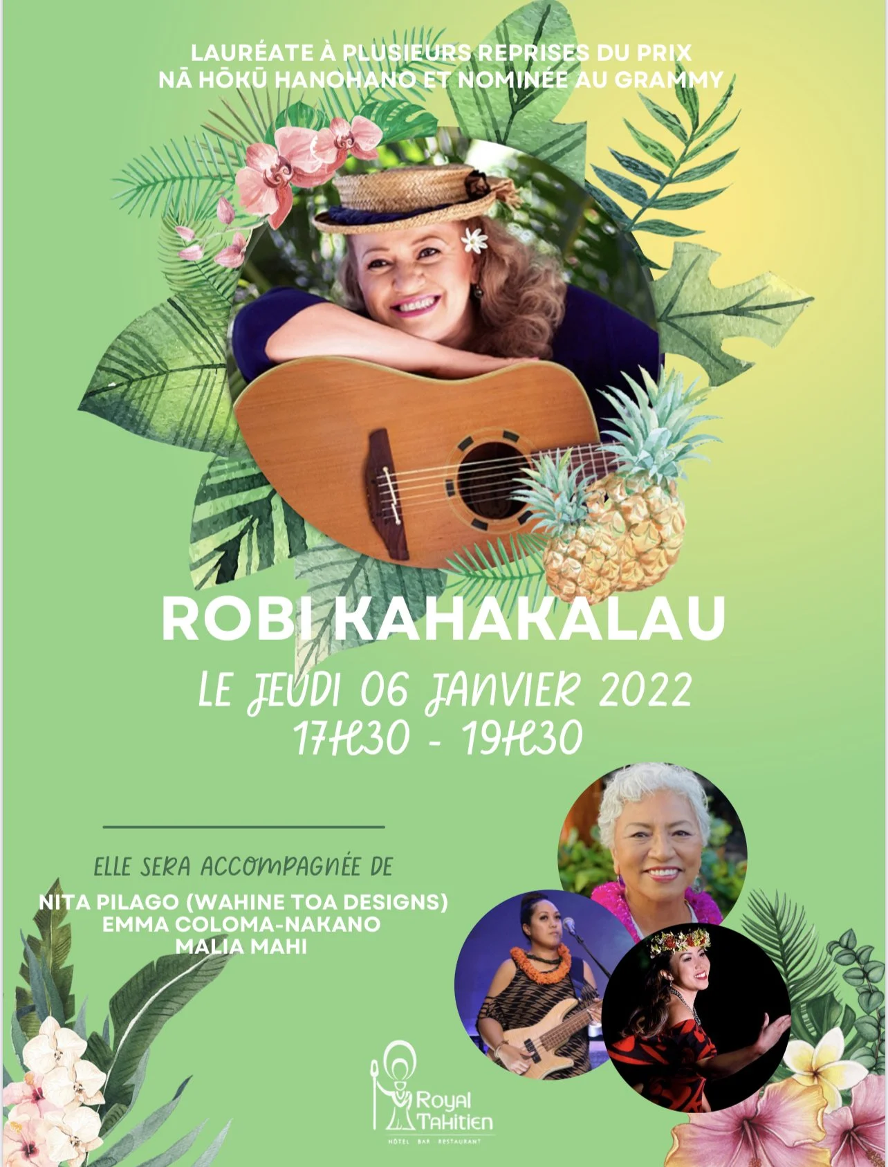 PIRAE. Hōkū Award winning female vocalist Robi Kahakalau returns to Tahiti in January, this time to celebrate her 60th birthday with friends at the Royal Tahitien Hotel on Thursday, January 6, 2022 from 5:30pm to 7:30pm. Robiʻs performance with her Hilo bassist Emma Coloma-Nakano, will be the first live Hawaiian music event in French Polynesia since the country reopened.